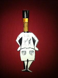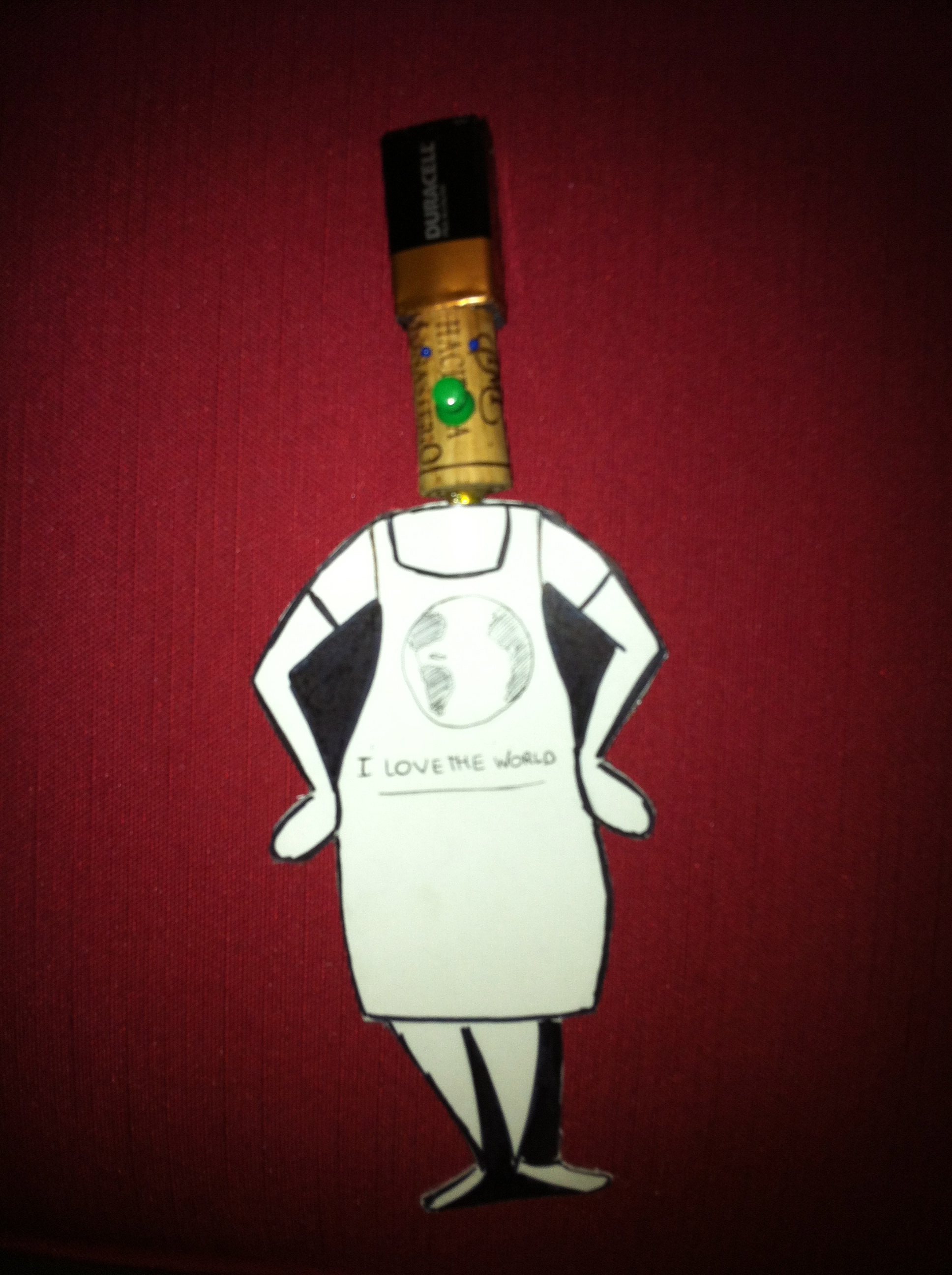 Hace unos años, mi hijo mayor se estaba quedando en casa de mis padres. Se puso a rebuscar en las gavetas del abuelo y allí encontró un corcho, algunas tachuelas y un alambre fuerte, no se imaginan las cosas que pueden encontrarse en las gavetas del abuelo. Lo cierto es que se le ocurrió hacer un muñequito, la cabeza era el corcho y con las tachuelas le hizo los ojos y la nariz. La forma del muñequito la dibujo con un papel sobre el alambre fuerte, y cuando lo terminó le puso un hilo y se lo regaló a mi mamá, que finalmente lo colgó en la cocina de su casa.